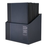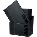 Menukansiot, laskukansiot ja viinikansiot. Nahkajäljitelmä menukansio jossa sokkopainettuna teksti "Menu". Nidotut kulmat. Helposti pyyhittävä, lisämuovitaskuja saatavilla.Nämä kansiot ovat laajennettavissa, niihin sopii useita tuplamuovitaskuja.